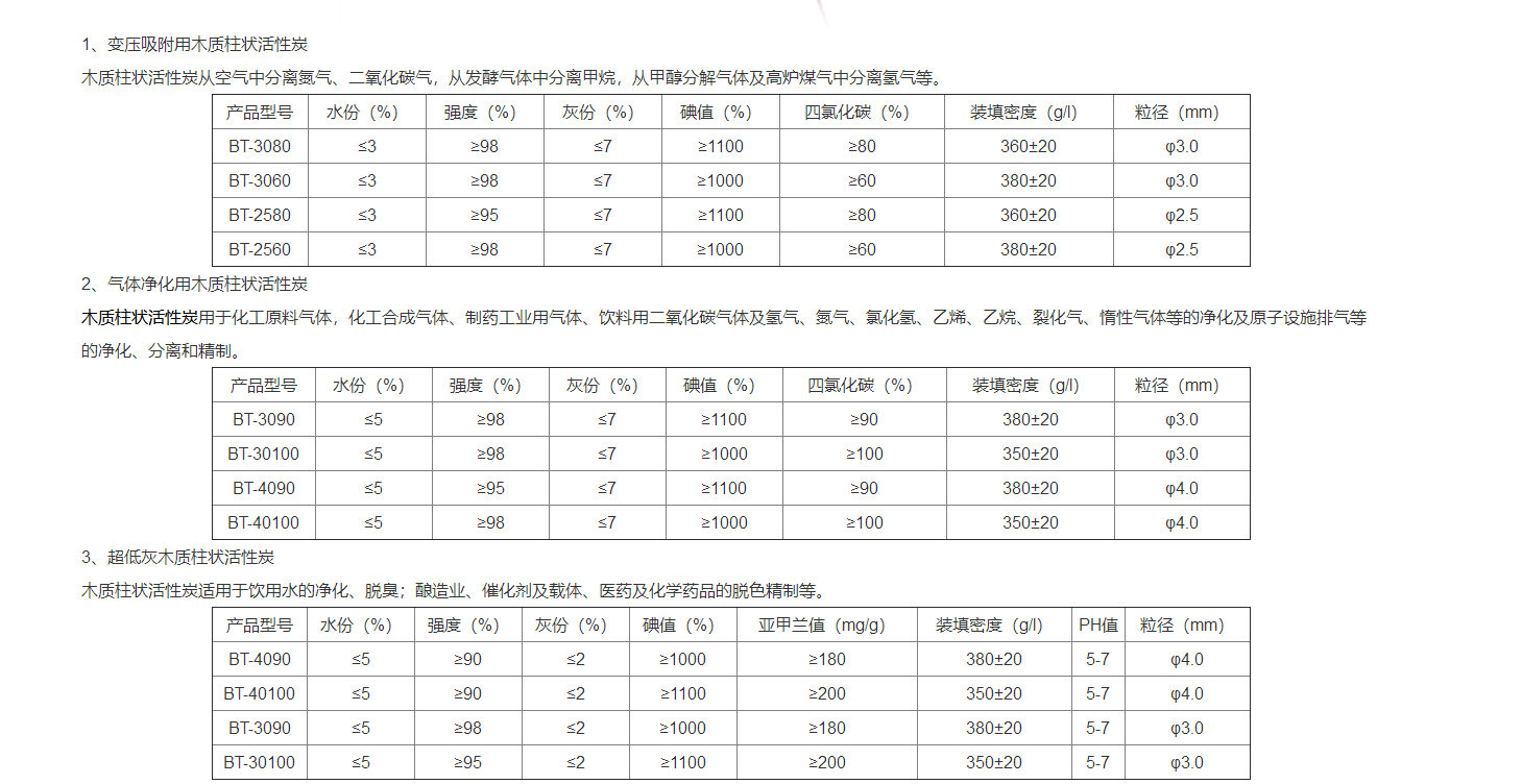 木質(zhì)活性炭主要分為:木質(zhì)柱狀活性炭、木質(zhì)顆粒活性炭、木質(zhì)粉狀活性炭。