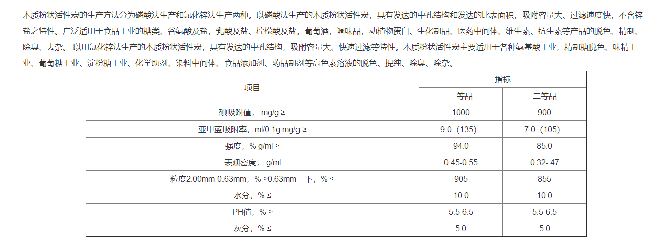 性能:以優(yōu)良木屑和果殼為原料,氯化鋅、磷酸為活化劑,經(jīng)碳化、活化精制而成,成品吸附能力優(yōu)異,雜質(zhì)含量。