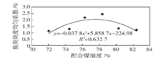 焦炭塊度均勻系數隨著配合煤細度的增加呈拋物線形式, 在約77%時達最大值。為了提高焦炭的大塊率, 因而配合煤細度也不易過高, 經測算細度為76%時, 焦炭大塊率較好。