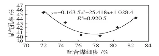 焦炭顯氣孔率隨著配合煤細度的增加呈拋物線形式, 在約77.5%時為最低值。