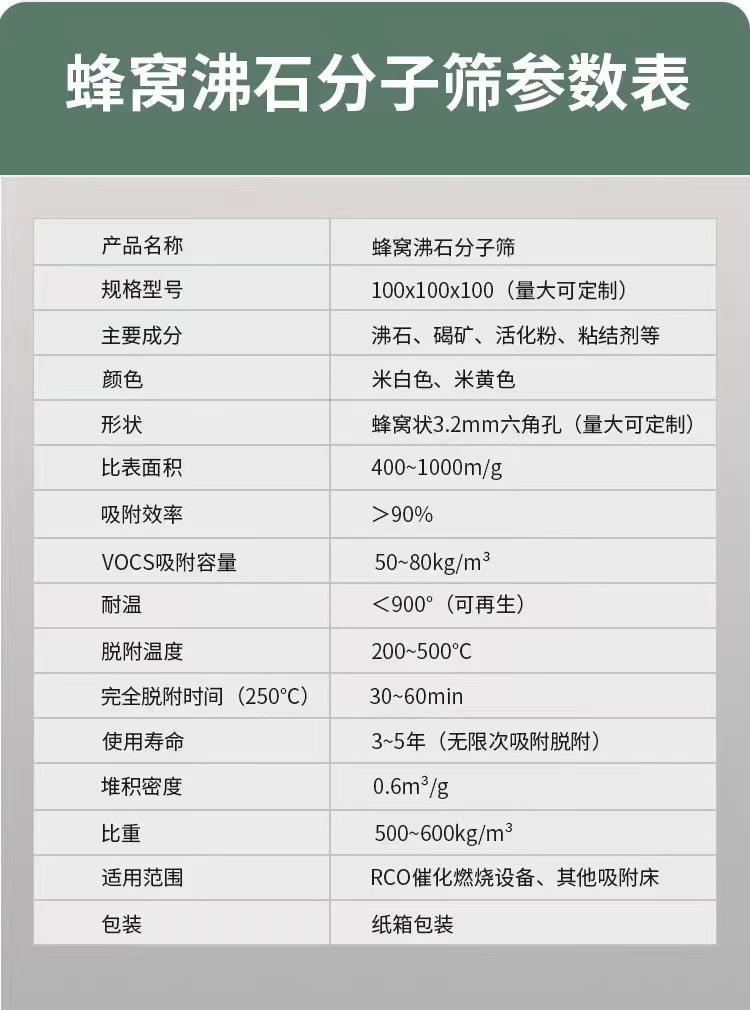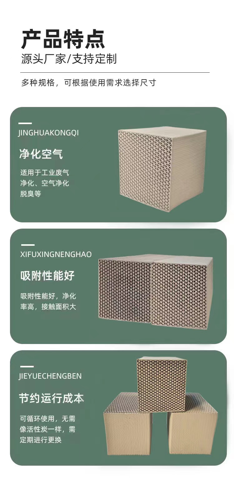 蜂窩沸石分子篩耐溫防水、適用范圍廣、使用成本低、使用壽命長,吸附能力強。替代活性炭,不產生危廢。