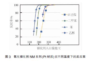 溫度不同時, 催化劑對VOCs 的處理活性效率也不同,因此需要尋找催化劑的最佳使用溫度。根據VOCs 廢氣中含有的主要有機揮發物(正己烷、二甲苯、苯、乙醇等物質),在不同入口溫度條件下對其進行轉化率測試評價,結果見圖3。