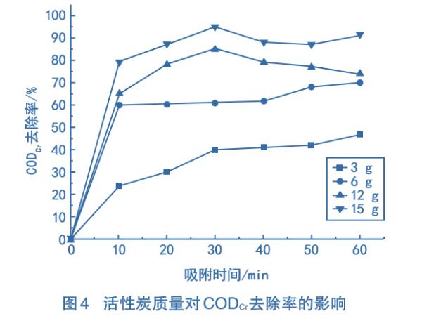 在染料廢水中,分別加入不同質(zhì)量的顆粒狀活性炭,在常溫條件下吸附,測定不同吸附時(shí)間的CODcr去除率,結(jié)果如圖4所示。